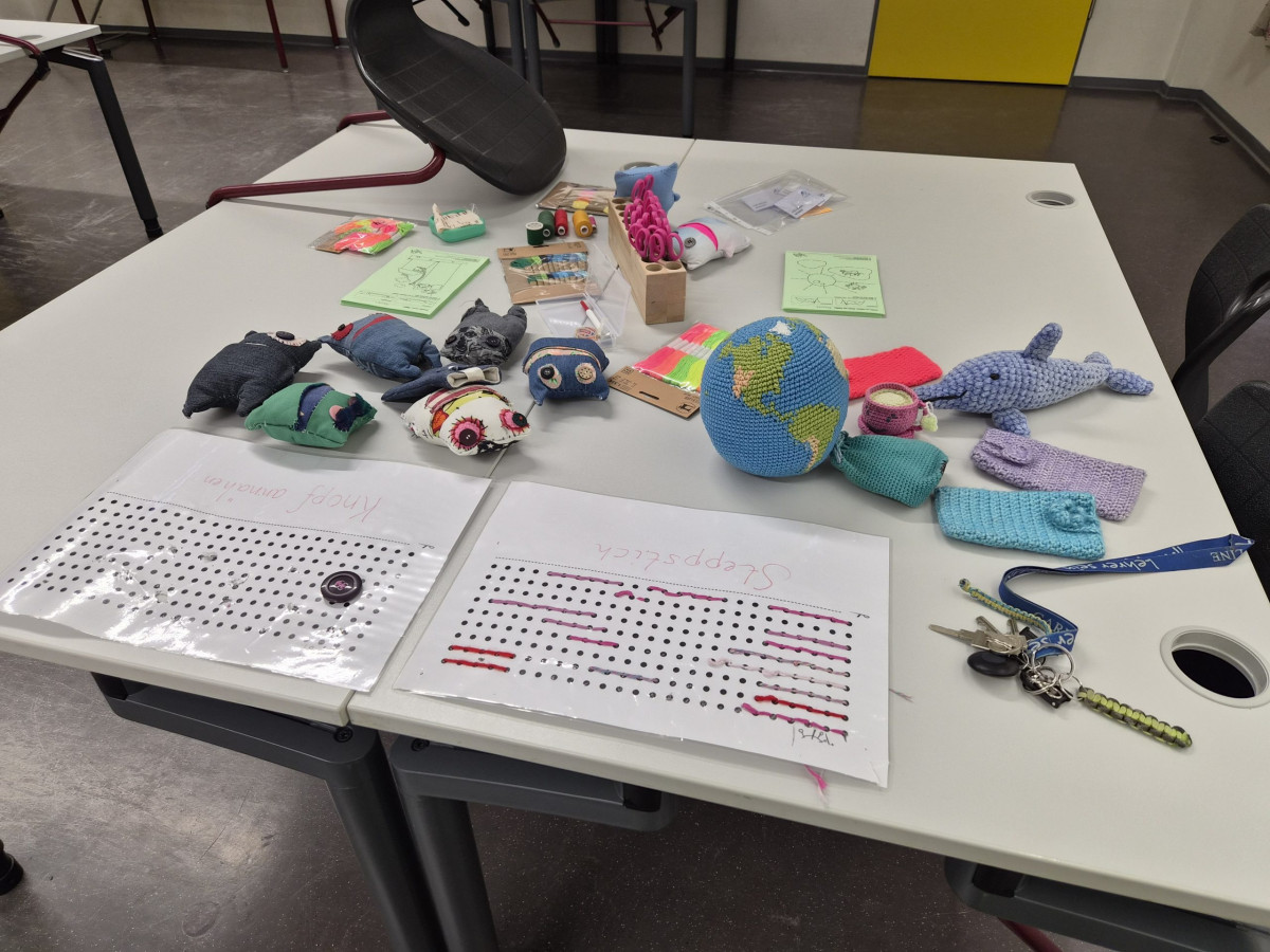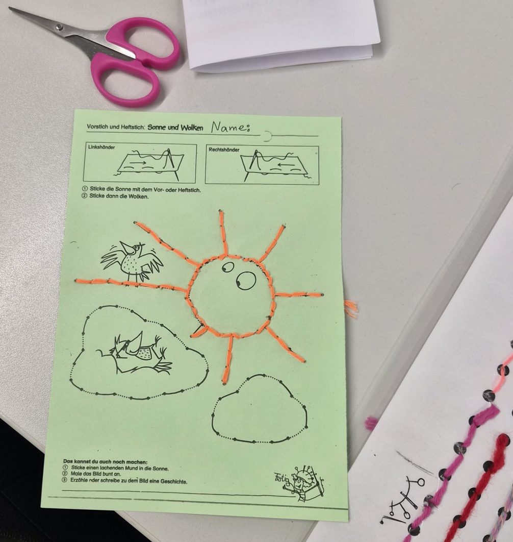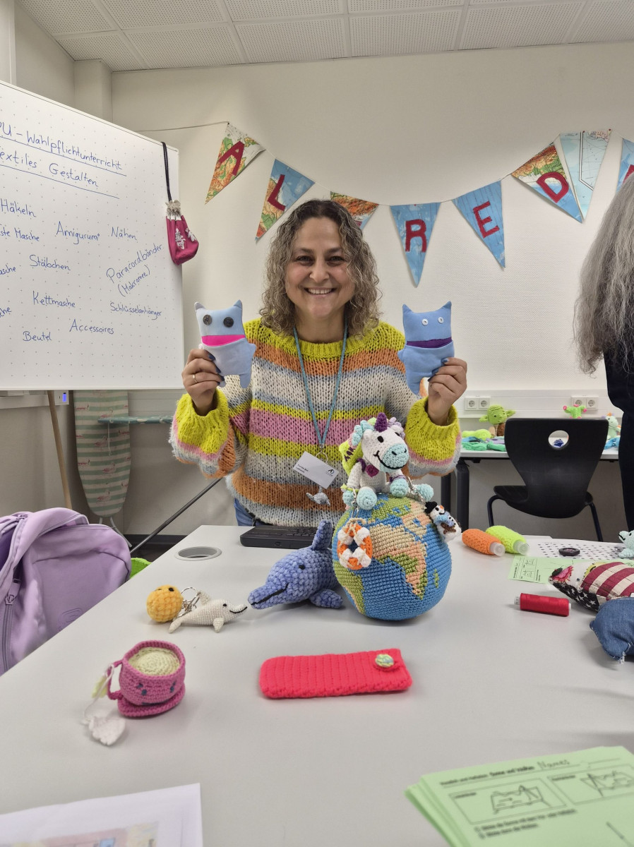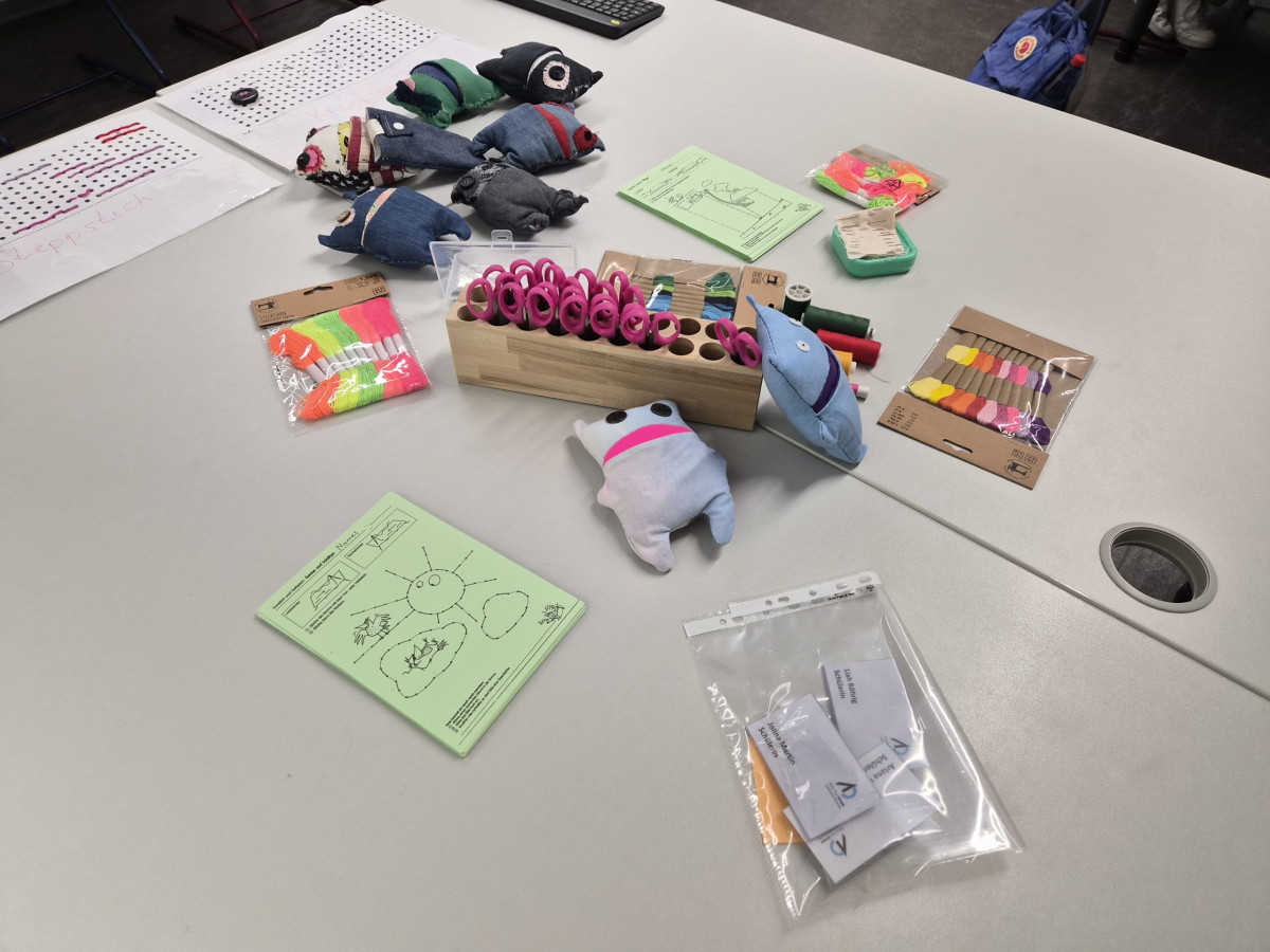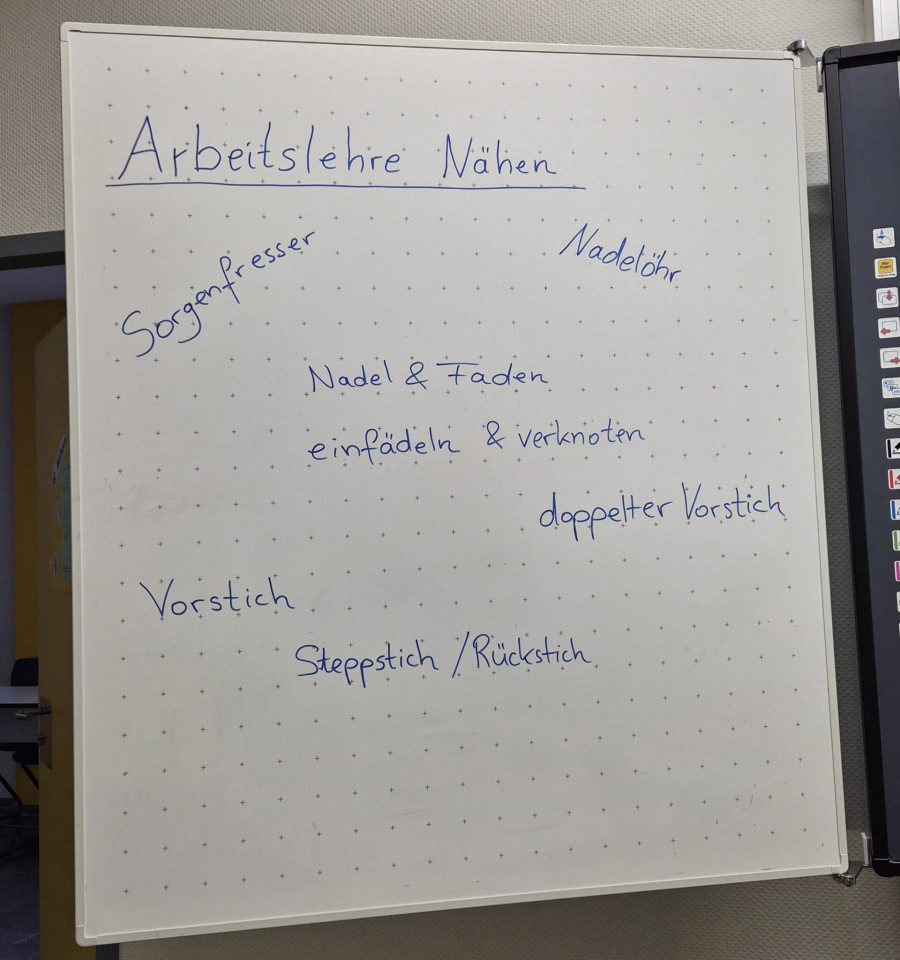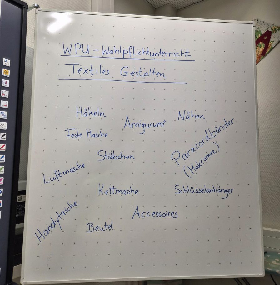 Im Fachbereich Arbeitslehre besuchten am Tag der offenen Tür zahlreiche Viertklässler mit ihren Eltern unter anderem den Textilraum. Nicht nur bestaunten sie die Exponate, die zum Teil von Schülerinnen und Schülern gefertigt wurden. Sie führten auch die Aufgabe des Papiernähens aus, um ihre Stempelkarte zu füllen. Bei fünf Stempeln an den unterschiedlichsten Mitmachstationen konnten sich die Kinder eine kleine Überraschung im Speisesaal abholen. Die Lehrinnen Frau Şen und Frau Kreber-Nickel hatten an der Mitmachstation großartige Unterstützung durch fleißige und motivierte Assistentinnen, die im 1. Halbjahr dieses Schuljahres am halbjährigen Kurs AL-Nähen erfolgreich teilgenommen hatten. Sie halfen beim Einfädeln und zeigten, wie man das Fadenende verknoten kann, so dass der Faden nicht durch das Papier durchrutscht. Sie demonstrierten den Vorstich und den doppelten Vorstich. Und schon machten sich die Gastkinder an die Arbeit. An der interaktiven Tafel konnten sich die Gäste Video-Tutorials anschauen und Schritt für Schritt die Entstehung eines Sorgenfressers, das von Hand genäht wird, oder das Häkeln eines Emoji-Schlüsselanhängers nachvollziehen.