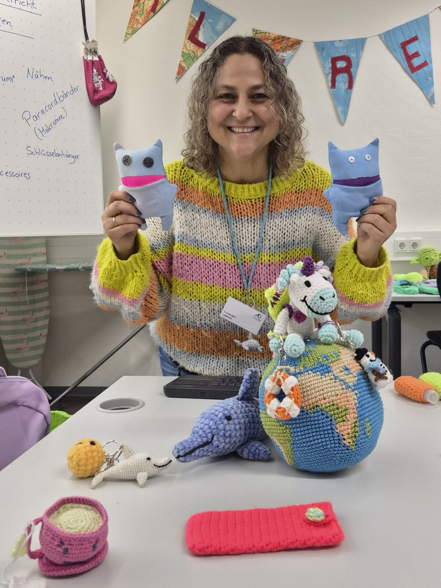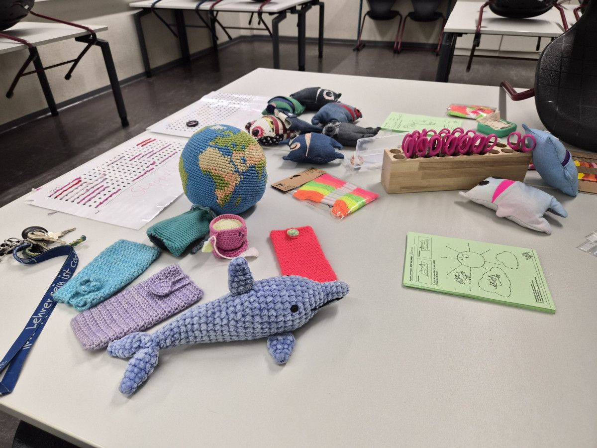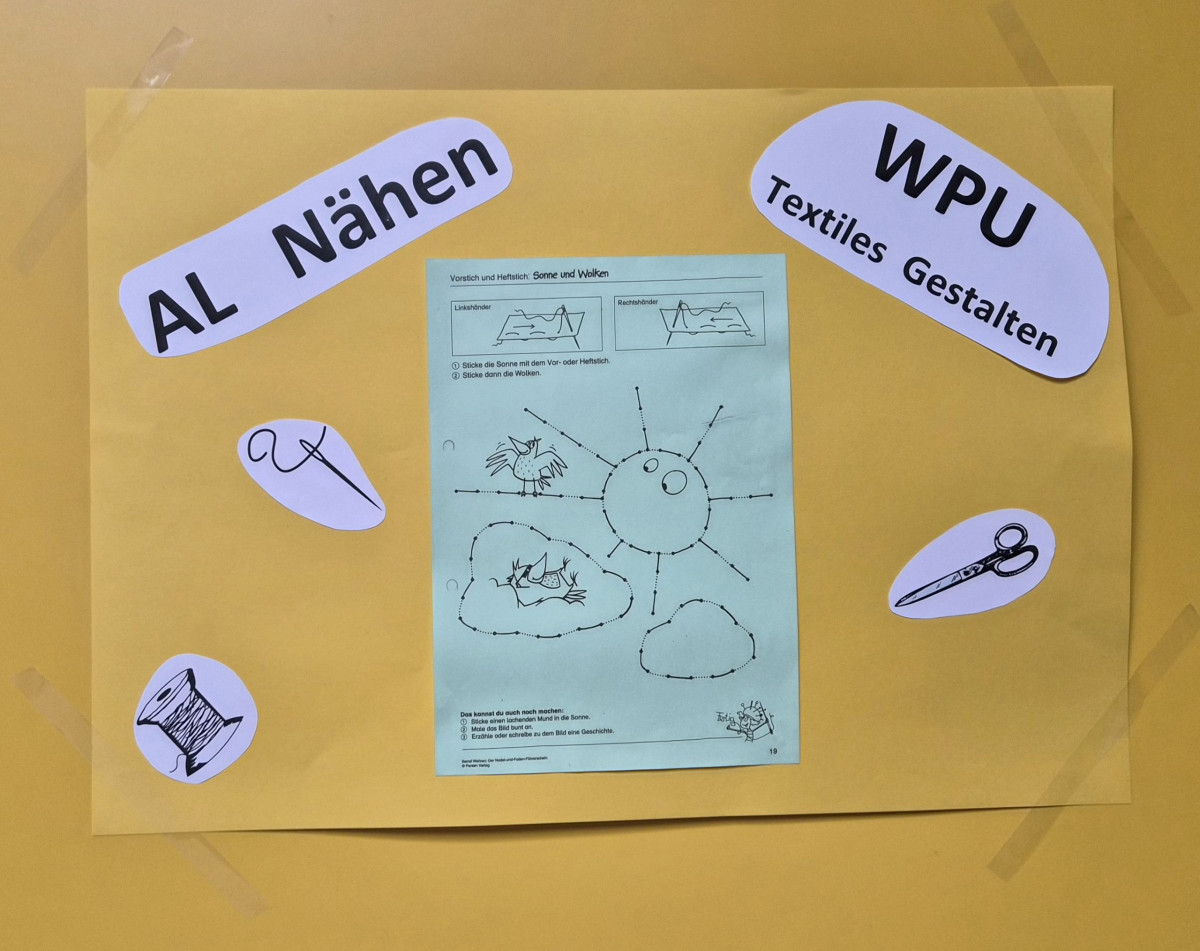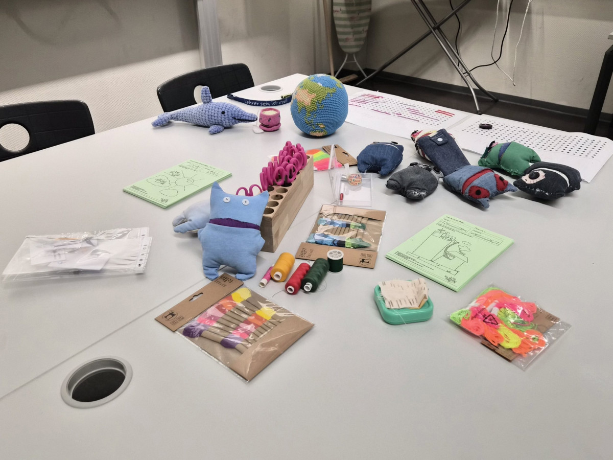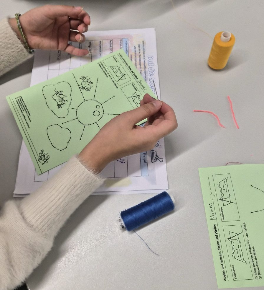 Im Fachbereich Arbeitslehre besuchten am Tag der offenen Tür zahlreiche Viertklässler mit ihren Eltern unter anderem den Textilraum. Nicht nur bestaunten sie die Exponate, die zum Teil von Schülerinnen und Schülern gefertigt wurden. Sie führten auch die Aufgabe des Papiernähens aus, um ihre Stempelkarte zu füllen. Bei fünf Stempeln an den unterschiedlichsten Mitmachstationen konnten sich die Kinder eine kleine Überraschung im Speisesaal abholen. Die Lehrinnen Frau Şen und Frau Kreber-Nickel hatten an der Mitmachstation großartige Unterstützung durch fleißige und motivierte Assistentinnen, die im 1. Halbjahr dieses Schuljahres am halbjährigen Kurs AL-Nähen erfolgreich teilgenommen hatten. Sie halfen beim Einfädeln und zeigten, wie man das Fadenende verknoten kann, so dass der Faden nicht durch das Papier durchrutscht. Sie demonstrierten den Vorstich und den doppelten Vorstich. Und schon machten sich die Gastkinder an die Arbeit. An der interaktiven Tafel konnten sich die Gäste Video-Tutorials anschauen und Schritt für Schritt die Entstehung eines Sorgenfressers, das von Hand genäht wird, oder das Häkeln eines Emoji-Schlüsselanhängers nachvollziehen.